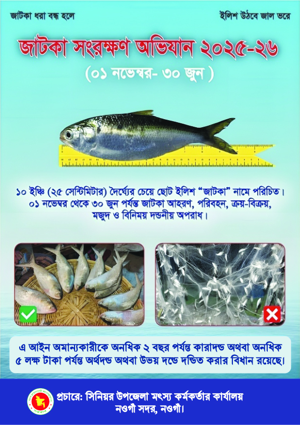 ১ নভেম্বর হতে ৩০ জুন পর্যন্ত মোট ৮ (আট) দিন জাটকা (১০ ইঞ্চি বা ২৫ সেন্টিমিটার এর চেয়ে ছোট ইলিশ) আহরণ, বিক্রয়, পরিবহন, মজুদ ও বাজারজাতকরণ সম্পূর্ণ নিষিদ্ধ প্রসঙ্গে।